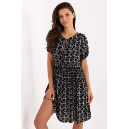 Lehké a pohodlné šaty s rozkročeným střihem, ideální na letní dny. Vyrobené z příjemné viskózy, která jemně obepíná postavu a zajišťuje prodyšnost. Potisk na materiálu ozvláštní outfit a dodá mu letní charakter. Šaty sahají před kolena, mají krátký rukáv a klasický kulatý výstřih. Místo tradičního zapínání mají originální šněrování vpředu až do pasu, které dodává kouzla. Rozkročený spodní lem zajišťuje volnost pohybu a lehkost nošení. Skvělý výběr na každodenní procházku, nákupy nebo setkání s přáteli. Stylové, pohodlné a plné letního kouzla.