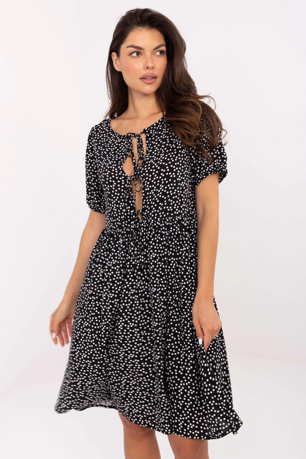 Lehké a pohodlné šaty s rozklosovaným střihem, ideální na letní dny. Vyrobené z příjemné viskózy, která jemně obepíná postavu a zajišťuje prodyšnost. Potisk na materiálu oživuje outfit a dodává mu letní charakter. Šaty sahají před kolena, mají krátký rukáv a klasický kulatý výstřih. Místo tradičního zapínání mají originální vázání vpředu až po pas, což jim dodává kouzlo. Rozklosovaný spodek zajišťuje volnost pohybu a lehkost nošení. Skvělá volba pro každodenní procházky, nákupy nebo setkání s přáteli. Stylové, pohodlné a plné letního kouzla.
