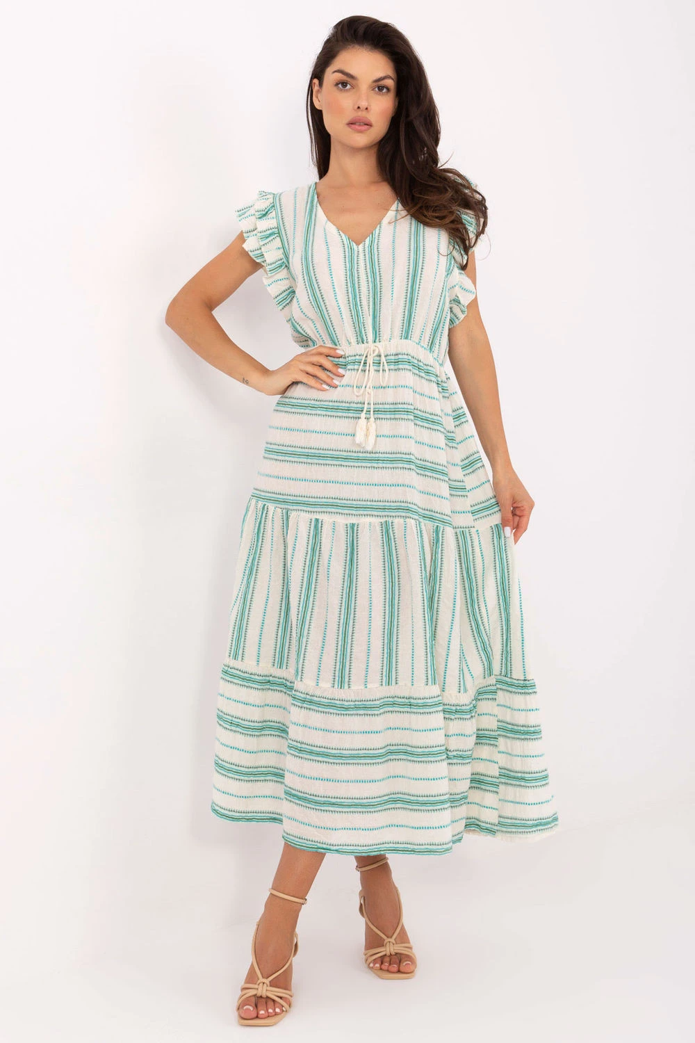 Elegantní šaty v boho stylu, ideální na letní dny. Vyrobené z prodyšné přírodní bavlny, zaručují pohodlí i v největším horku. Střih ve střihu midi krásně padne na postavě a zdůrazňuje ženskost, a pásek umožňuje individuální přizpůsobení. Šaty mají výstřih do srdce, který zúží krk a dodá lehkost, a krátké rukávy ve formě volánků, které jim dodávají dívčí půvab. Materiál je zdoben jemným vyšíváním, což zdůrazňuje jejich boho charakter. Model se obléká přes hlavu bez zapínání. Skvěle se hodí na procházky, nákupy nebo setkání s přáteli. Ideální volba pro ženy, které si cení stylu a pohodlí v letním provedení.