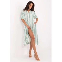 Lehké a pohodlné šaty v boho stylu, ideální na každodenní letní outfit. Oversize střih poskytuje volnost pohybu a pohodlí nošení, zatímco midi délka je skvělá jak na pláž, tak i do města. Košilový model se zapínáním na knoflíky a výstřihem do špičky, který decentně zdůrazňuje krk. Vyrobena z směsi bavlny, polyesteru a dalších vláken, šaty jsou prodyšné, příjemné na dotek a praktické na teplé dny. Krátké rukávy a volný střih dodávají lehkost. Celkový vzhled dotvářejí pruhy a dekorativní vyšívání, které dodávají charakteristický boho vzhled. Další výhodou jsou kapsy skryté v bočních švech, funkční a diskrétně začleněné do střihu. Ideální na každodenní vycházky, procházky, dovolené nebo jako stylový plážový přehoz.