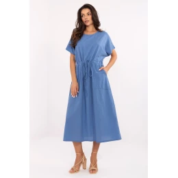 Průhledné a pohodlné letní šaty s rozkročeným střihem, vyrobené z přírodní bavlny. Hladká látka poskytuje pohodlí a skvěle se hodí do každodenního stylu. Model midi délky s krátkým rukávem a klasickým kulatým výstřihem. V pase je šňůrka, která dokáže zdůraznit postavu a přizpůsobit šaty postavě. Další výhodou jsou praktické kapsy, které dodávají funkčnost a uvolněnost. Ideální volba na letní procházky, nákupy, práci nebo setkání s přáteli. Univerzální a nadčasová, bude skvělým základem pro mnoho stylizací.