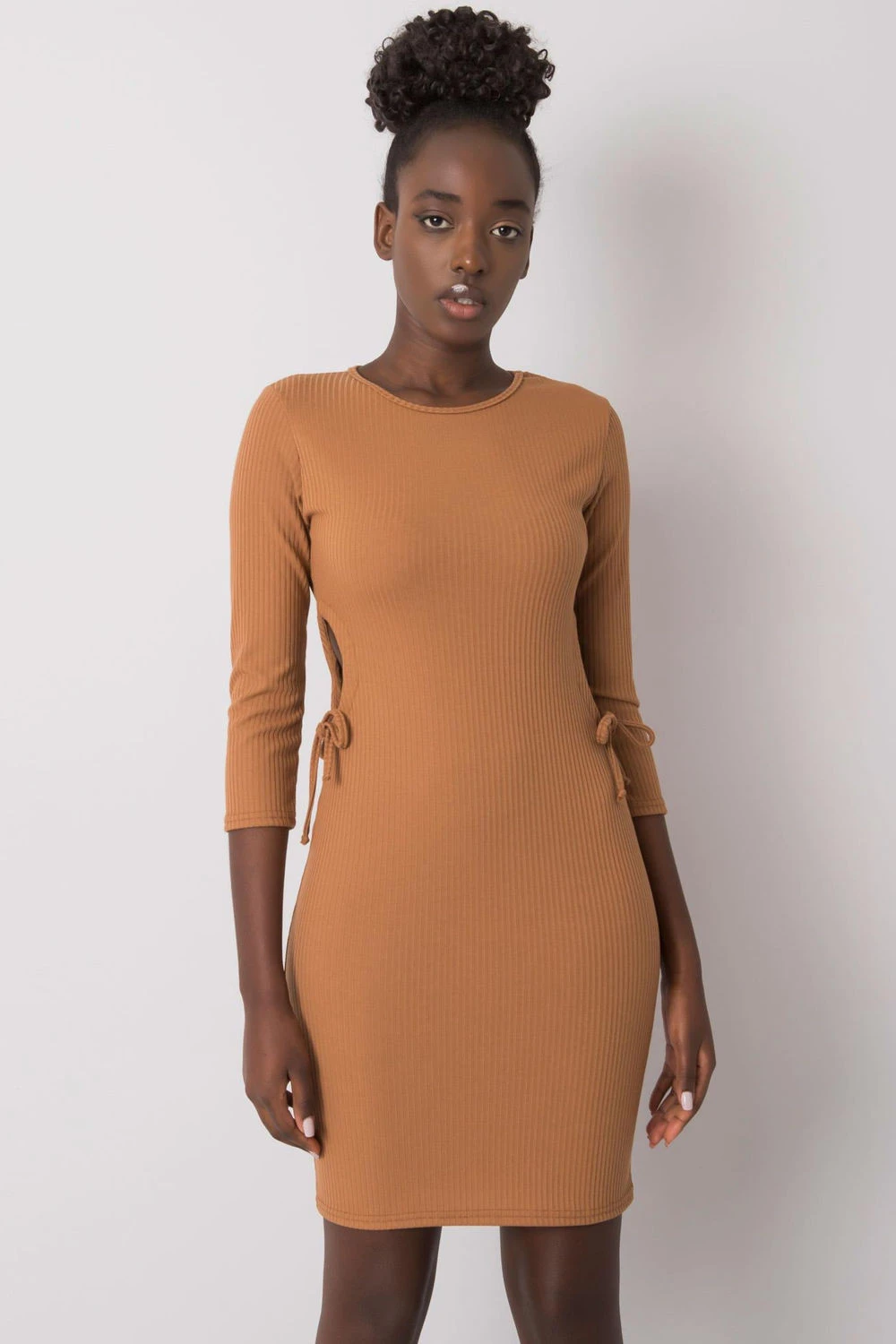 Každodenní olověná šaty ze žebrované látky jsou stylovým a pohodlným návrhem na každý den. Vyrobené z bavlny s přídavkem elastanu se přizpůsobují postavě a zajišťují pohodlí při nošení. Model s mini délkou, kulatým výstřihem a 3/4 rukávem zdůrazňuje ženskou postavu a dodává celku moderní charakter. Hladký vzor je doplněn efektními výstřihy po stranách s dekorativním šněrováním, které šatě dodávají originalitu. Ideální k teniskám, botám nebo sandálům na každou každodenní příležitost.