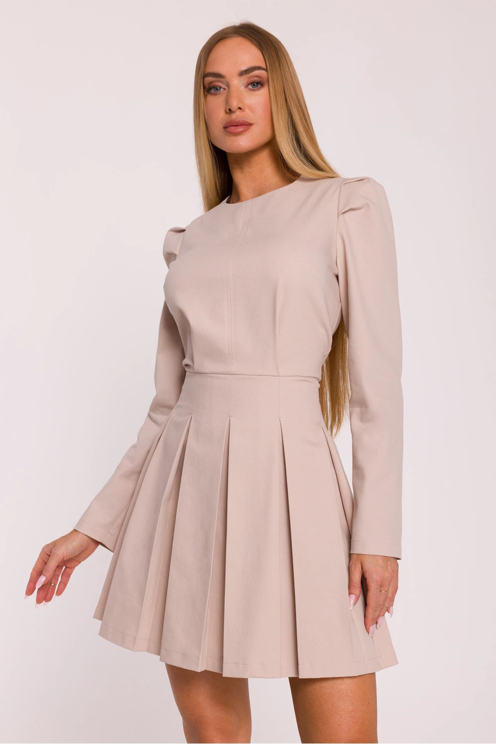 Šaty ušité z látky imitující džínovinu jsou elegantní a moderní volbou, ideální na mnoho příležitostí. Materiál je lehce tuhý, matný a jemně elastický, díky čemuž krásně drží tvar a zdůrazňuje střih. Model má klasický, kulatý výstřih a dlouhé rukávy s jemnými záložkami na ramenou, které dodávají siluetě výraznosti a elegance. Přiléhavý vrchní díl plynule přechází do rozkvetlého spodního dílu s kontrafaldami, vytvářejícím ženskou, harmonickou linii. Skrytý zip na zádech zajišťuje pohodlné oblékání a absence podšívky zajišťuje, že šaty jsou lehké a pohodlné na nošení. Střih zdůrazňuje pas, akcentuje ramena a krásně modeluje postavu. Mini délka dodává celku moderní charakter a jemně odhaluje nohy, díky čemuž se kreace skvěle hodí jak na každodenní nošení, tak na speciální události. Navrženo a ušito v Polsku s důrazem na detaily a ženskou siluetu.