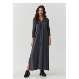 Vsadíte na nadčasovou klasiku a maximální pohodlí! Naše dlouhá maxi šaty vyrobené z vysoce kvalitní viskózy s přídavkem elastanu jsou ideální volbou jak pro každodenní nošení, tak i na speciální příležitosti. Díky přírodní prodyšnosti viskózy a pružnosti látky se šaty krásně přizpůsobí postavě, neomezují pohyb. Model má výstřih ve tvaru V, který decentně zdůrazňuje ženské tvary, a lehce rozšířený střih s rozparkem na bocích dodává lehkost a moderní charakter. Dlouhé rukávy zaručují, že se šaty hodí na každou roční dobu - můžete je nosit jak na jaře a v létě, tak i na podzim a v zimě ve spojení s botami nebo kozačkami. K dispozici jsou ve stylových barvách: čokoládová - hluboký, elegantní odstín, který zdůrazňuje krásu a dodává třídu, černá - nadčasová klasika, nenahraditelná v každé skříni, khaki - stylová a univerzální barva v militaristickém stylu a antracit - hluboký, tmavě šedý odstín ideální pro elegantní i každodenní stylizace. Tyto maxi šaty jsou skvělou volbou pro ženy, které ocení pohodlí, minimalismus a elegantní styl. Skvěle vypadají jak s sportovními teniskami, tak s elegantními podpatky.
