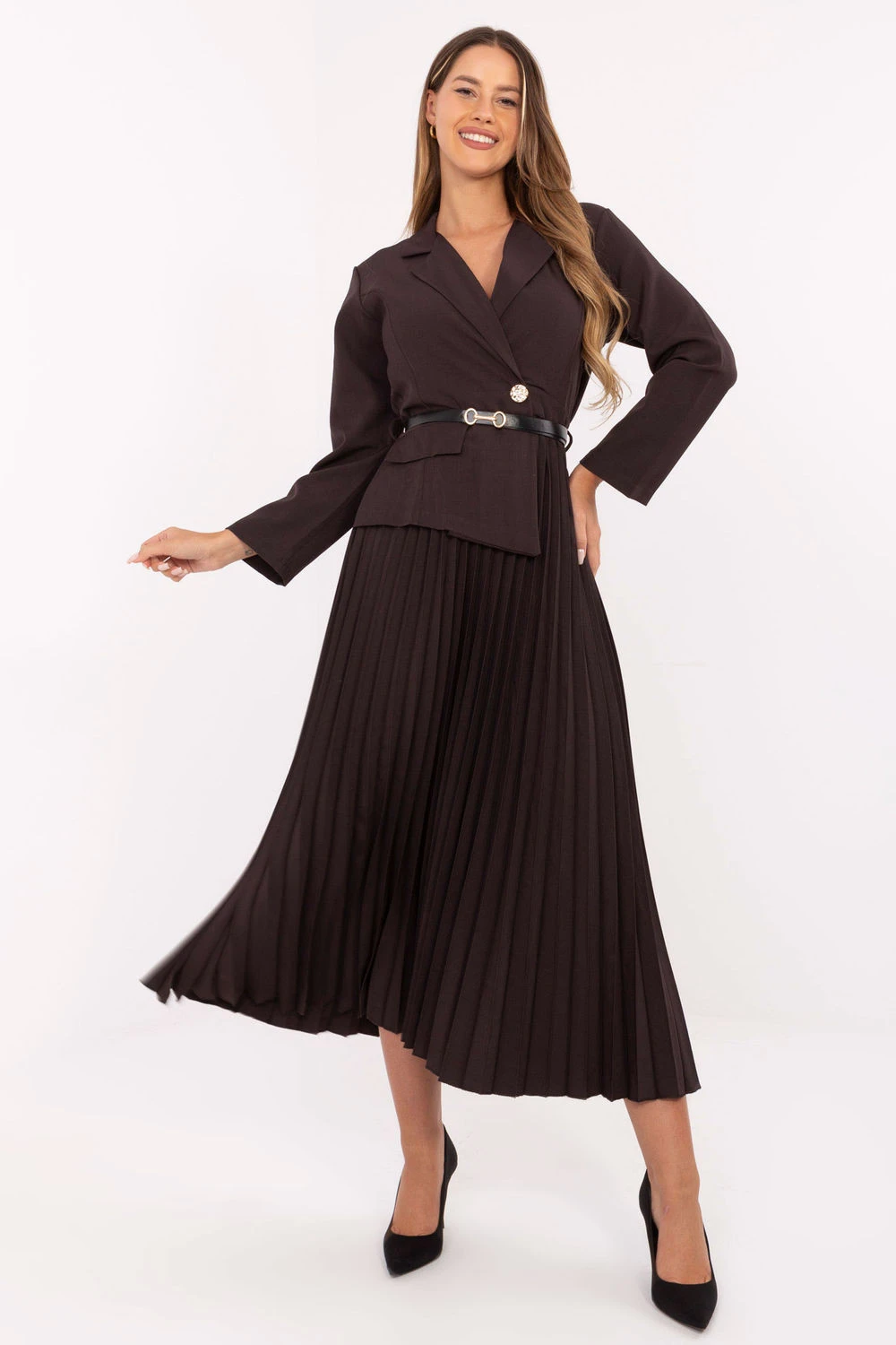 Elegantní maxi šaty s rozkročeným střihem, ideální jak do práce, tak na formální události. Horní část v námořnickém stylu s klasickým límcem a knoflíkem dodává celku eleganci a profesionální charakter. Od pasu dolů jsou šaty vyrobeny z plisované látky, která se krásně usazuje při pohybu, zdůrazňujíc lehkost a ženskou grácii. Dlouhé rukávy dodávají eleganci a zapínací opasek zdůrazňuje pas a dodává postavě proporce. Celkový dojem je hladký, a dominantní směs viskózy a polyesteru zajišťuje pohodlí nošení a trvanlivost materiálu.