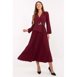 Elegantní maxi šaty ve skladném střihu, ideální jak do práce, tak na společenské události. Horní část v námořnickém stylu s klasickým límečkem a knoflíkem dodává celku eleganci a profesionální charakter. Od pasu dolů jsou šaty vyrobeny z plisované látky, která se krásně pohybuje, zdůrazňuje lehkost a ženskou eleganci. Dlouhé rukávy přidávají eleganci, a zapínací pásek zdůrazňuje pas a dodává postavě proporce. Celý kus je dokončen hladkým povrchem, a dominující směs viskózy a polyesteru zaručuje pohodlí nošení a trvanlivost materiálu.