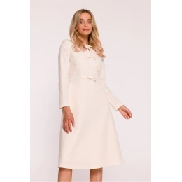 Elegantní šaty vyrobené z hladké látky, celé vybavené podšívkou, která zajišťuje pohodlí nošení a ideální uspořádání materiálu. Polokruhový výstřih pod krk s jemným rozparem dodává celku jemný akcent, zatímco dlouhé rukávy zdůrazňují klasický charakter modelu. Široký střih ve tvaru písmene A zaručuje pohodlí a lehkost, zatímco ozdobné mašličky na přední straně dodávají šatům dívčí grády a výjimečnou eleganci. Volný spodní díl v bocích a délka pod kolena dělají tento model mimořádně univerzálním a hodí se na mnoho příležitostí, od rodinných setkání po formální události. Navrženo a ušito v Polsku.