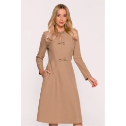 Šaty ve tvaru trapezu, ušité z hladké látky s jemnou melírovanou strukturou. Polooblý výstřih pod krkem je oživen jemným rozštěpem, který dodává celku lehkost. Dlouhé rukávy zdůrazňují elegantní charakter modelu a praktické kapsy ukryté v bočních švech zvyšují pohodlí nošení. Na přední straně jsou ozdobné mašle umístěny uprostřed, které šatům dodávají dívčí kouzlo a výjimečné provedení. Volnější spodek v bocích ve tvaru písmene A a délka za kolena zajišťují, že střih vypadá uvolněně a zároveň stylově. Model bez podšívky, zapínání na skrytý zip vzadu, se skvěle hodí jak na každý den, tak i na formální události. Navrženo a ušito v Polsku.