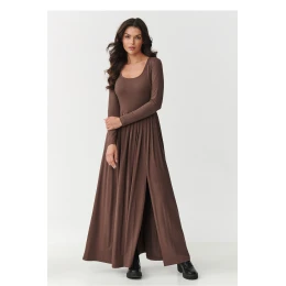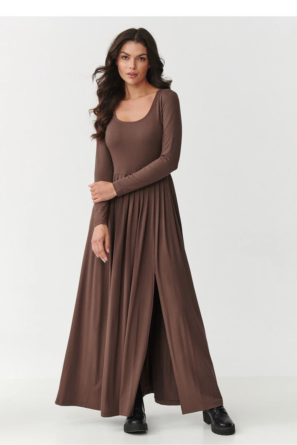 Dlouhé šaty s jednoduchým, ale elegantním střihem jsou skvělou volbou pro ženy, které hledají pohodlí a styl v jednom. Vyrobené z lehké a prodyšné viskózy, která poskytuje pohodlí po celý den. Střih šatů je mimořádně univerzální a nadčasový, kombinující klasický styl s moderními akcenty. Horní část šatů s přiléhavým střihem zdůrazňuje postavu, zatímco spodek ve formě volného, jemně rozšířeného materiálu maskuje nedokonalosti a zajišťuje volnost pohybu a lehkost. Jemné rozříznutí na boku nejen dodává šatům smyslný charakter, ale také zajišťuje, že šaty získávají dynamický, módní vzhled. Dlouhé rukávy přidávají eleganci a dělají z šatů ideální volbu i na chladnější dny. Díky takové kombinaci střihu šaty pasují k mnoha příležitostem, od každodenních setkání přes večerní vycházky až po formální události. Jedná se o návrh, který spojuje ženskost, pohodlí a modernost, osvědčující se v různých stylizacích a situacích.