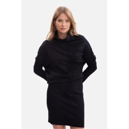 Šaty jsou vyrobeny z vysoce kvalitního žebrovaného pleteného materiálu o gramáži 250 g, který krásně padne na postavu a zajišťuje pohodlí při nošení. Model se obléká přes hlavu, bez kapes a podšívky, díky čemuž zůstává lehký a pohodlný. Vysoký stojánek s měkkým polstrováním dodává šatům jedinečný charakter, jemně obepínající krk. Dlouhé, netopýří rukávy se zužují ke dnu a vytvářejí efektní linii ramen, volnější horní část v kombinaci s přiléhavým, ceruzkovým spodkem dodává šatům bluzovaný střih, který zdůrazňuje pas a zjemňuje postavu. Délka mini, sahající před koleno, dělá ze šatů ideální kombinaci elegance s ženskou lehkostí. Navrženo a ušito v Polsku z pleteniny vyrobené v Lodži, je to nabídka pro ženy, které si cení místního řemesla, vysoké kvality a nadčasového stylu.