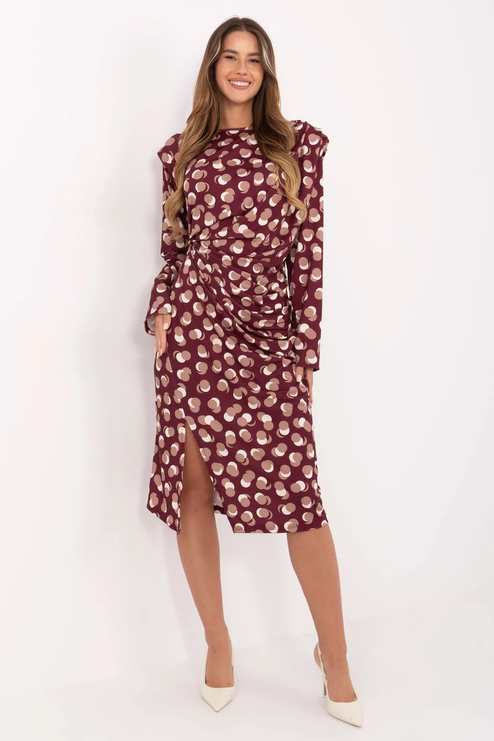 Elegantní midi šaty s jednoduchým, klasickým střihem jsou ideální volbou na mnoho příležitostí do práce, na schůzky nebo na každodenní vycházky. Vyrobené z vysoké kvality viskózy a polyesteru, kombinují pohodlí s odolností. Geometrický vzor jí dodává moderní charakter a vestavěné polštářky na ramenou jemně zdůrazňují linii postavy. Model s dlouhým rukávem a kulatým výstřihem vypadá velmi elegantně. Drapování na pravém boku v oblasti pasu a efektní záhyby krásně tvarují postavu, přidávají jí lehkost a ženskou grácii. Šaty nemají zapínání, což je dělá pohodlnými na oblékání.