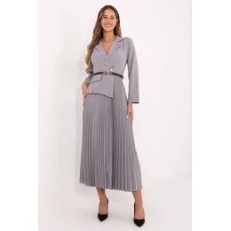 Elegantní maxi šaty s rozkročeným střihem, ideální jak do práce, tak na formální události. Horní část v námořnickém stylu s klasickým límečkem a knoflíkem dodává celku eleganci a profesionální charakter. Od pasu dolů je šaty vyrobeny z plisované látky, která se krásně skládá v pohybu, zdůrazňující lehkost a ženský půvab. Dlouhé rukávy přidávají eleganci, a zapínací pásek zdůrazňuje pas a dodává siluetě proporce. Celkový vzhled je udržován v hladkém provedení a dominující směs viskózy a polyesteru zaručuje pohodlí nošení a odolnost materiálu.