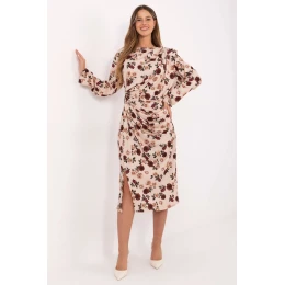 Elegantní šaty midi s jednoduchým, klasickým střihem jsou ideální volbou pro mnoho příležitostí, jako jsou pracovní schůzky, návštěvy či každodenní vycházky. Vyrobena z vysoce kvalitní směsi viskózy a polyesteru spojuje pohodlí s odolností. Květinový vzor jí dodává romantický charakter a vestavěné polštářky na ramenou jemně zdůrazňují siluetu. Model s dlouhým rukávem a kulatým výstřihem vypadá velmi elegantně. Drapování na pravé straně v oblasti pasu a efektní záhyby krásně tvarují postavu, přidávají jí lehkost a ženskou grácii. Šaty nemají zapínání, což je dělá pohodlnými při oblékání.