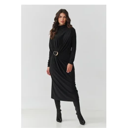 Podtrhněte svou ženskost a eleganci díky výjimečné midi šaty s ozdobným sběrem a efektním sponou v pasu. Tato stylová šaty volného střihu krásně padnou na postavě, maskují drobné nedokonalosti a dodávají lehkost každému pohybu. Vyrobená z měkkého, elastického materiálu zaručuje pohodlí při nošení po celý den, jak při obchodních schůzkách, tak i večerních výstupech. Dlouhé rukávy a midi délka ji činí ideální volbou pro chladnější dny, a černá barva dodává charakter a třídu. Tyto šaty spojují moderní eleganci a nadčasový styl. Stačí k nim vybrat oblíbené kozačky nebo lodičky, abyste vytvořili vzhled, který přitahuje pohledy!