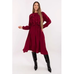 Elegantní košilové šaty ve střihu rozkročené, ideální na každý den, do práce a na slavnostní příležitosti. Vyrobené z viskózy, poskytují pohodlí, lehkost a přirozené uspořádání materiálu na postavě. Model v délce midi se vyznačuje hladkým vzorem, který jí dodává eleganci a univerzální charakter. Šaty mají dlouhý objemný rukáv s manžetou, co jí dodává jemnou eleganci. Horní část je zakončena stojáčkem a knoflíkovým zapínáním do pasu, díky čemuž se kreace spojuje se šikem košilového střihu s ženskou lehkostí. Po obou stranách knoflíkové lišty jsou jemné volánky, které šatě dodávají zvláštní půvab. Do pasu je vsazena guma, zajistící ideální přizpůsobení a pohodlí nošení, a dodatečný pásek ke šněrování zdůrazňuje pas a umožňuje nastavit stupeň přizpůsobení. Jedná se o stylový a zároveň praktický návrh pro ženy, které oceňují eleganci a pohodlí ve svém každodenním vystoupení.