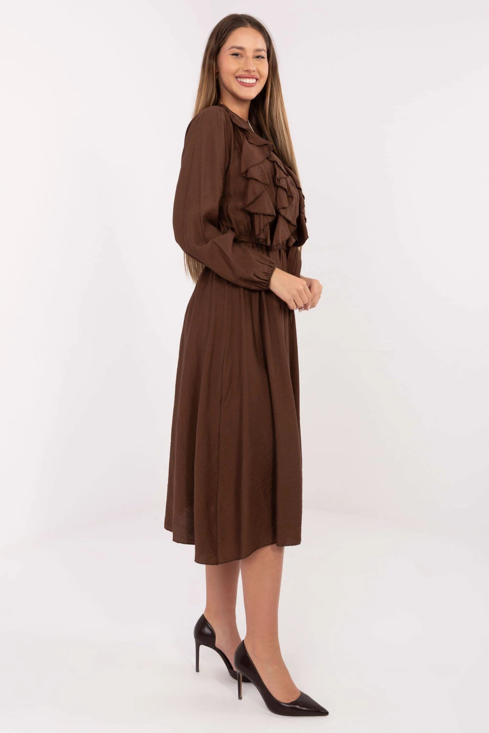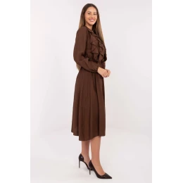 Elegantní košilové šaty s rozšířeným střihem, ideální na každý den, do práce a na slavnostní příležitosti. Vyrobené z viskózy, poskytují pohodlí, lehkost a přirozené uspořádání materiálu na postavě. Model midi délky se vyznačuje hladkým vzorem, který jí dodává eleganci a univerzální charakter. Šaty mají dlouhý nadýchaný rukáv s manžetou, co jim dodává jemnou eleganci. Horní část je zakončena stojáčkem a zapínáním na knoflíky až do pasu, díky čemuž se kreace spojuje se šikem košilového střihu a ženskou lehkostí. Po stranách knoflíkové lišty jsou jemné volánky, které šatě dodávají zvláštní půvab. V pasu je vsazena gumová vložka, zajišťující ideální přizpůsobení a pohodlí nošení, a dodatečný pásek k zavázání zdůrazňuje pas a umožňuje nastavit stupeň přizpůsobení. Jedná se o stylový a zároveň praktický návrh pro ženy, které ocení eleganci a pohodlí v každodenním provedení.