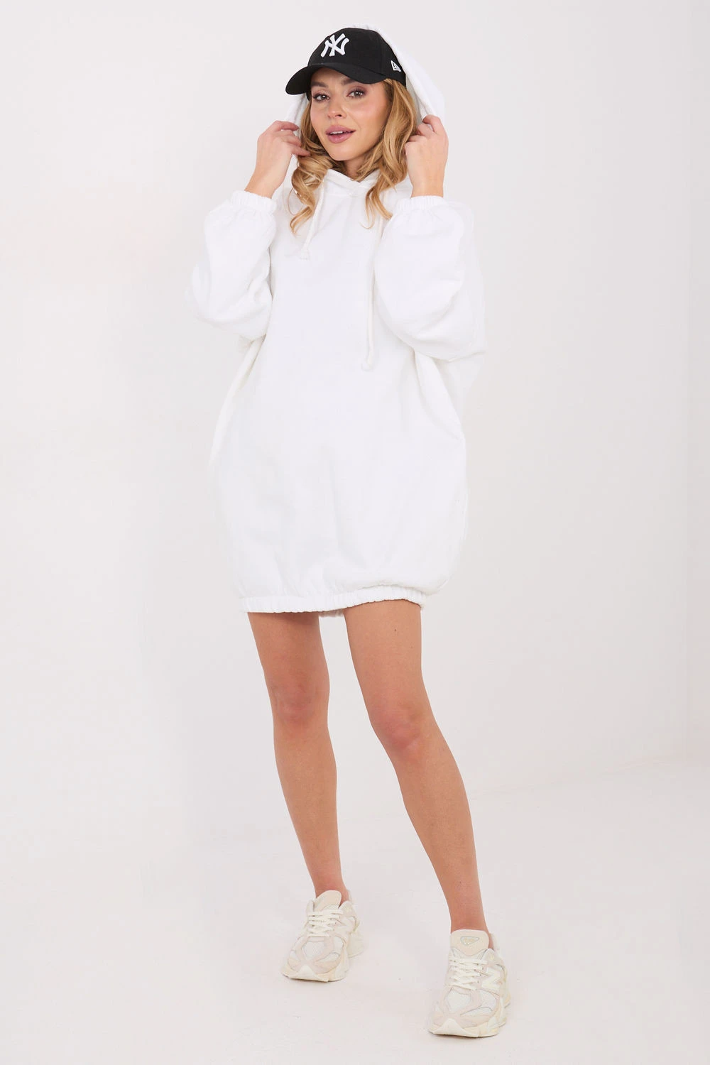 Dresové šaty ve stylu oversized jsou pohodlným a stylovým návrhem pro každodenní outfit. Vyrobené z vysoce kvalitní bavlny s přídavkem elastanu zajistí pohodlí nošení, pružnost a volnost pohybu. Hladký vzor zdůrazňuje jejich univerzální charakter a umožňuje snadné sladění s různými doplňky. Model s mini délkou, dlouhými rukávy a praktickou kapucí se obléká přes hlavu. Guma vsazená dole jemně sbírá šaty, dodávají jim moderní vzhled a lehce sportovní charakter. Zateplení zajistí teplo v chladnějších dnech a kapsy skryté v bočních švech zvyšují funkčnost. Ideální návrh na každý den, k nošení s teniskami, sneakers nebo kotníčkovými botami.