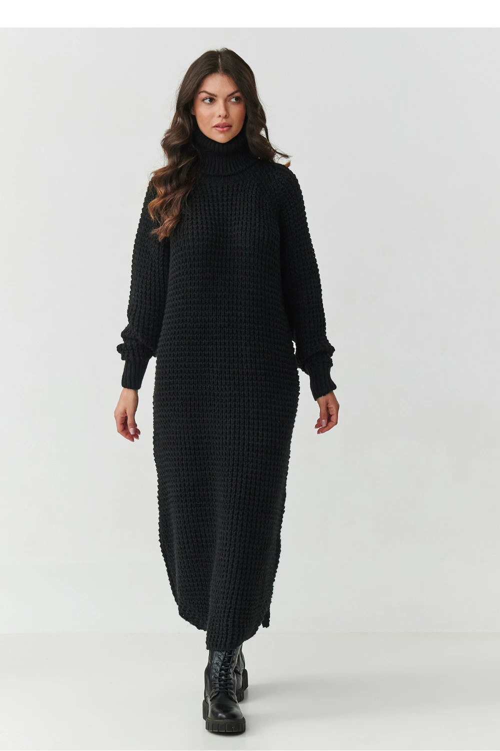 Ponořte se do podzimně-zimního klimatu s šaty, které spojují módní design, pohodlí a praktičnost. Dámské svetrové šaty s vysokým golfovým límcem jsou nabídkou, která se hodí jak do každodenního nošení, tak do elegantních stylizací. Vyrobena z vysoce kvalitní pleteniny, která kombinuje akryl a polyamid, je měkká, příjemná na dotek a odolná proti deformacím. Díky tomu si zachovává skvělý vzhled i po mnoha praních a zároveň zahřeje v chladnějších dnech. Vysoký, obepínající límec chrání před chladem a dodává styl a dlouhé rukávy a volný střih zajistí pohodlí nošení. Střih midi zjemňuje postavu a hodí se k různým typům postavy, zatímco rozřezání po stranách dodávají lehkost a zdůrazňují moderní charakter. Tyto svetrové šaty midi s golfovým límcem jsou must-have v každém šatníku, ideální do práce, na schůzky nebo pro zimní procházky. Stačí je sladit s botami nebo kozačkami, abyste vytvořili efektní stylizaci na každou příležitost.