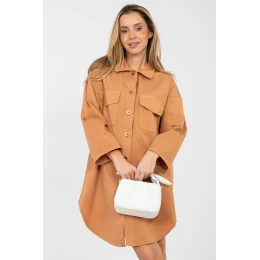 Pohodlné košilové šaty s voľným strihom, ideálne pre každodenné štýlovanie. Model so zapínaním na gombíky a klasickým golierom, ktorý dodáva celku nadčasový charakter. Hladký vzor robí šaty veľmi univerzálnymi a ľahko štýlovateľnými. Vyrobené z príjemnej bavlny s prídavkom elastanu, zabezpečujú pohodlie a voľnosť pohybu. Dlhý rukáv s možnosťou zaháknutia umožňuje prispôsobiť šaty ročnému obdobiu a individuálnym preferenciám. Dĺžka po koleno a spodok vykrojený do polkruhu jemne podčiarkujú postavu a dodávajú ľahkosť. Na prednej strane sú praktické vrecká s ploštinami, ktoré zdôrazňujú štýl šaty. Skvelá ponuka na každý deň do práce, na prechádzku alebo stretnutie v uvoľnenej atmosfére.