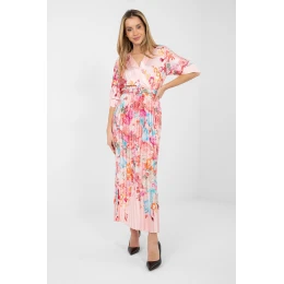Letní maxi šaty s rozkročeným střihem jsou spojením lehkosti, elegance a ženského stylu. Model okouzluje květinovým vzorem, který dodává stylizaci svěžest a jemný šarm, ideální pro letní atmosféru. Základní límec krásně zdůrazňuje linii krku a dekoltu, zatímco 3/4 rukávy s mašlí dodávají celku romantický charakter. Od pasu dolů jsou šaty vyrobeny z plisované látky, která se efektně usazuje při pohybu a dodává postavě lehkost. V pasu je pásek na zapínání, který podtrhuje ženské tvary a přizpůsobí se postavě. Šaty nemají zapínání, což zajišťuje pohodlnost nošení. Vyrobené z kombinace polyesteru a viskózy jsou prodyšné, lehké a pohodlné. Skvěle se hodí jak do každodenních stylizací, do práce, tak i na společenské příležitosti, stačí vybrat vhodné doplňky, abyste vytvořili elegantní letní vzhled.