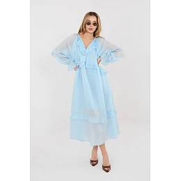 Letní šaty v boho stylu s volným, volným střihem, které poskytují pohodlí a lehkost při každodenním nošení. Vyrobena z příjemné látky, která spojuje viskózu a nylon, díky čemuž je materiál prodyšný a dobře se drží na postavě. Model s hladkým vzorem a délkou midi se hodí jak na každý den, tak na letní procházky nebo setkání. Šaty mají lehkou bavlněnou podšívku, která je kratší než vnější vrstva, což dodává celku jemnou lehkost a jemný efekt vrstvení. Dlouhé nafouklé rukávy zůstávají bez podšívky, díky čemuž jsou vzdušné a zdůrazňují boho charakter modelu. Přední část šatů zdobí efektní volány a na výstřihu je dekorativní šněrování s volánem, které stylizaci dodává romantický vzhled. Model bez zapínání, pohodlný na nasazování a ideální na každodenní stylizace.