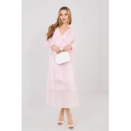 Letní šaty v boho stylu s volným, uvolněným střihem, které poskytují pohodlí a lehkost při každodenním nošení. Vyrobené z příjemné látky dotýkající se těla, která je kombinací viskózy a nylonu, díky čemuž je materiál prodyšný a dobře padne na postavě. Model s hladkým vzorem a délkou midi se hodí jak na každý den, tak na letní procházky nebo setkání. Šaty mají bavlněnou lehkou podšívku, která je kratší než vnější vrstva, což celkovému vzhledu dodává subtilní lehkost a jemný efekt vrstev. Dlouhé, nadýchané rukávy zůstávají bez podšívky, díky čemuž jsou vzdušné a zdůrazňují boho charakter modelu. Přední část šatů zdobí efektní volány a u výstřihu je dekorativní uzlíček s volánem, který stylizaci dodává romantický vzhled. Model bez zapínání, pohodlný na oblékání a ideální na každodenní outfit.
