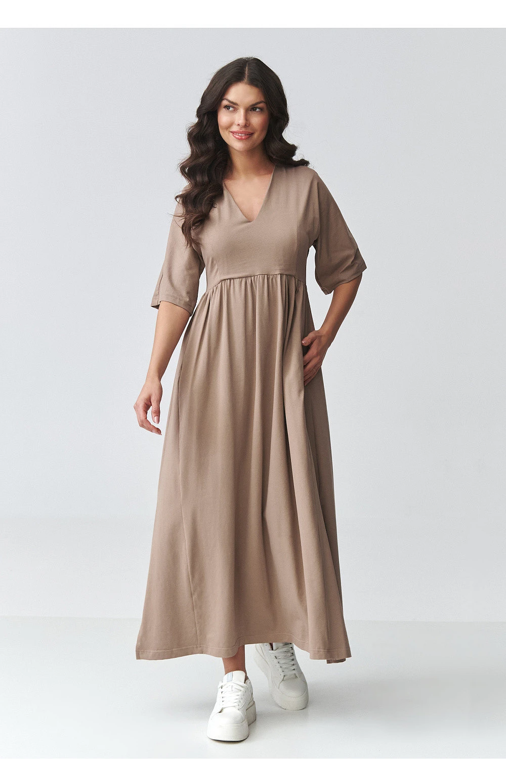 Elegantní maxi šaty jsou ideální kombinací pohodlí a nadčasové elegance. Jejich volný, uvolněný střih se krásně přizpůsobuje postavě, poskytující pohodlí po celý den. Jemný výstřih ve tvaru písmene V decentně zdůrazňuje linii krku, zatímco řez pod prsy dodává lehkost a ženský charakter. Dlouhé šaty jsou vyrobeny z příjemné, prodyšné látky, která se osvědčí jak v teplejších dnech, tak při vrstvených stylizacích. Krátké rukávy a rozparky po stranách jí dodávají moderní vzhled a pohodlí pohybu. Šaty skvěle ladí s doplňky od sportovních tenisek po elegantní sandály nebo boty. Jedná se o univerzální dámské šaty, které se osvědčí na mnoha příležitostech, ať už jde o práci, procházku, setkání s přáteli nebo dovolenou.