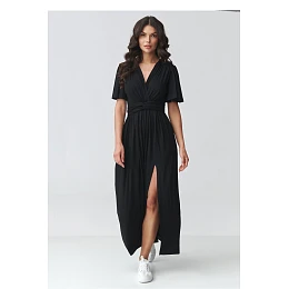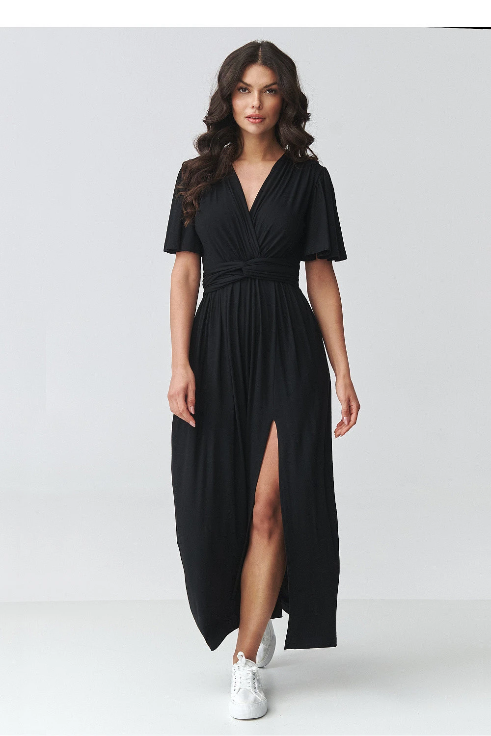 Elegantní maxi šaty jsou skvělým návrhem pro ženy, které oceňují eleganci, ženskost a pohodlí. Model s efektním záhybovým výstřihem krásně zdůrazňuje linii hrudníku a zužuje krk, což dodává siluetě lehkost a eleganci. Krátké, volné rukávy zajišťují volnost pohybu a pohodlí při nošení po celý den. V pasu je přeložený pás zdůrazňující pas, který tvaruje postavu a dodává proporce. Délka maxi ve spojení s jemným štěrbinou na noze dodává stylizaci smyslnost a dělá z elegantní dámské šaty skvělou volbu pro večírky, rodinné oslavy i romantickou večeři. Lehce padající materiál zajišťuje, že maxi šaty vypadají neuvěřitelně efektně v pohybu. Je to ideální volba pro ženy, které hledají nadčasový střih, který spojuje moderní šaty na svatbu, večírek nebo speciální událost s pohodlím a ženským stylem.