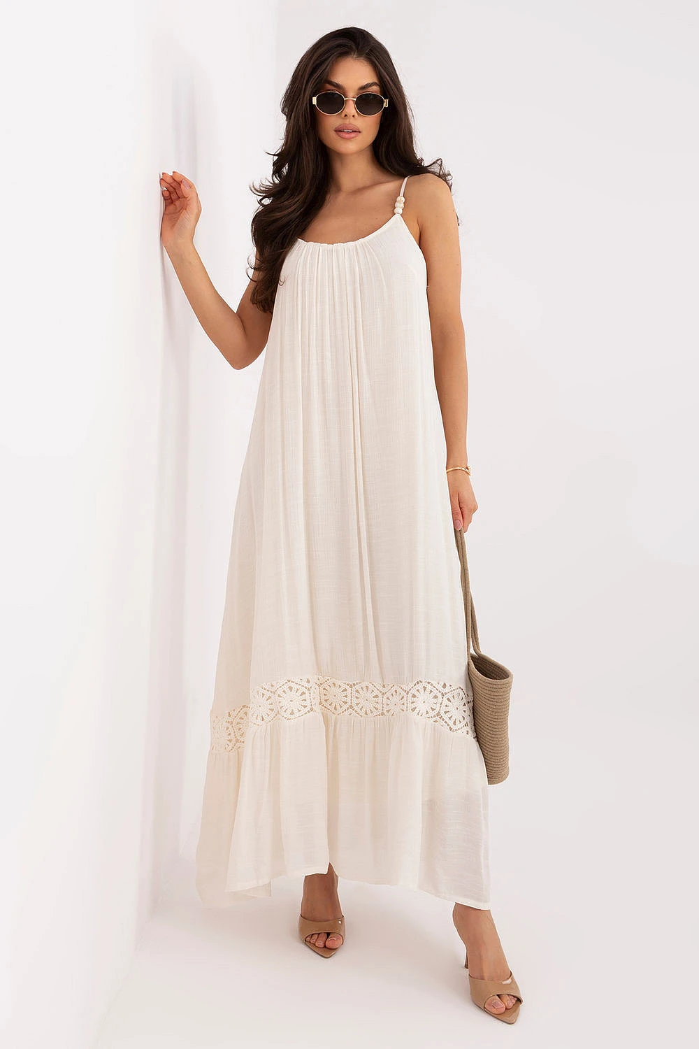 Šaty v letním boho stylu jsou lehkým a ženským návrhem ideálním pro každodenní styling. Jejich volný střih poskytuje pohodlí a krásně padne při pohybu, zdůrazňujíc letní, nezávazný charakter. Model maxi délky je navržen v hladkém stylu, doplněný o jemný krajkový lem dole, který celku dodává něhu a romantické zakončení. Kulatý výstřih a tenká ramínka s nastavitelností zaručují pohodlné přizpůsobení siluetě. Další výhodou jsou ozdobné korálky na ramínkách, které šatě dodávají charakteristický boho akcent a zdůrazňují její dovolenkový styl. Absence zapínání činí model praktickým a snadno použitelným. Vyrobené z bavlněné a polyesterové směsi jsou šaty prodyšné, příjemné na dotek a pohodlné na nošení i v teplých dnech. Je to ideální volba na léto, procházky a každodenní výlety ve volném, stylovém provedení.