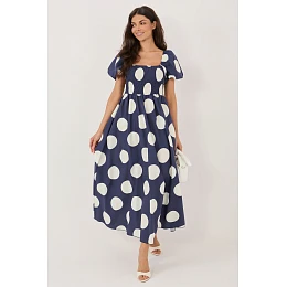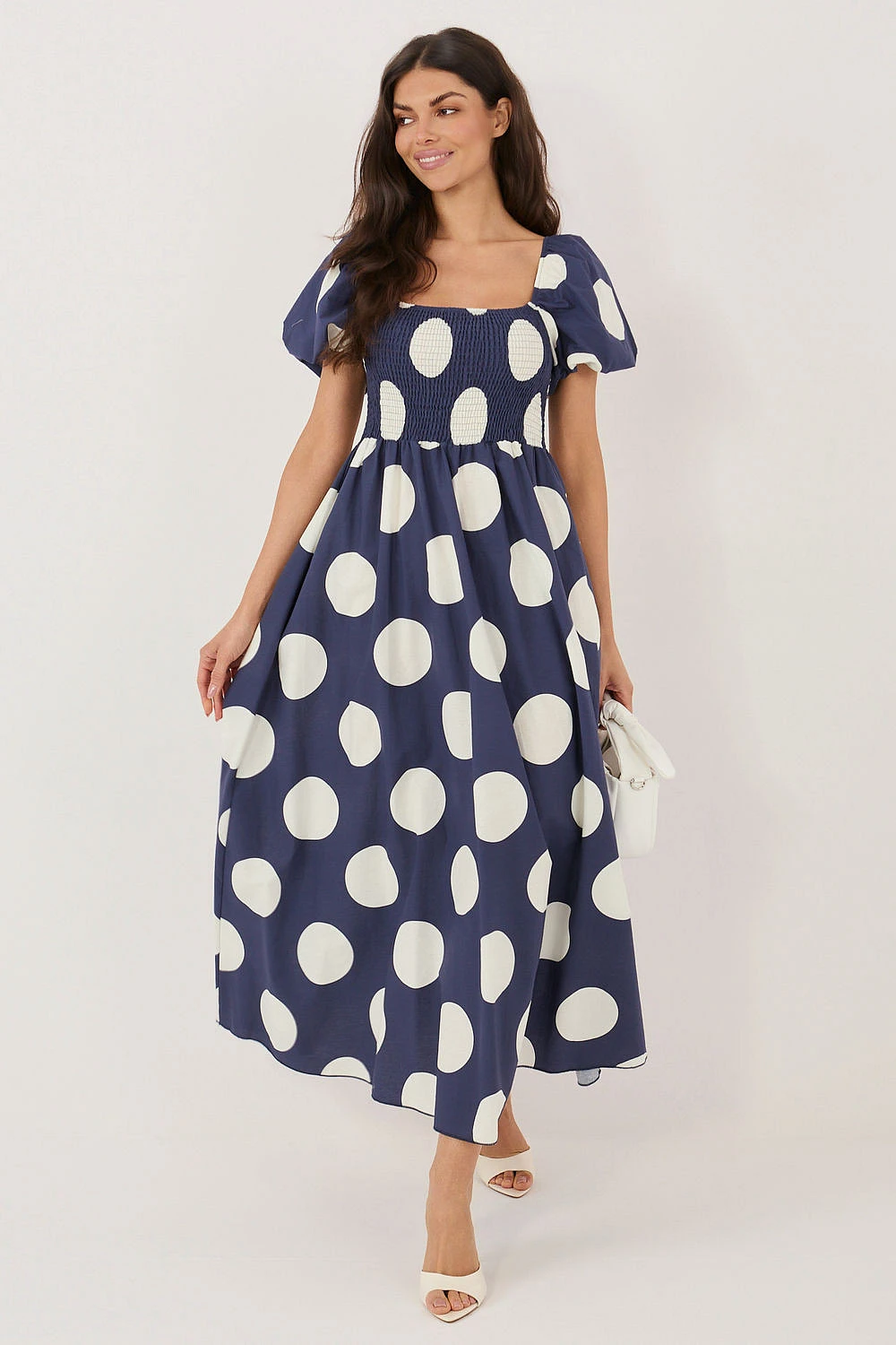 Šaty letního střihu jsou stylovým a ženským návrhem, který se skvěle hodí jak na každodenní nošení, do práce, tak i na více formální události. Vzor v puntíkách jí dodává nadčasové kouzlo a jemnou lehkost, zapadající do klasických a zároveň moderních trendů. Model s maxi délkou skvěle padne na postavu, a hispánský výstřih efektně zdůrazní ramena a krk. Krátký objemný rukáv dodává celku romantický charakter a jemnou objemnost. Škrticí gumičky v horní části umožňují ideální přizpůsobení obvodu, zajistí pohodlné nošení a přizpůsobení postavě. Bez zapínání je šaty praktické a snadné na používání. Vyrobena z přírodní bavlny je prodyšná, příjemná k pokožce a skvělá na teplé dny. Univerzální a elegantní návrh, který spojuje pohodlí s ženským, stylovým vzhledem.