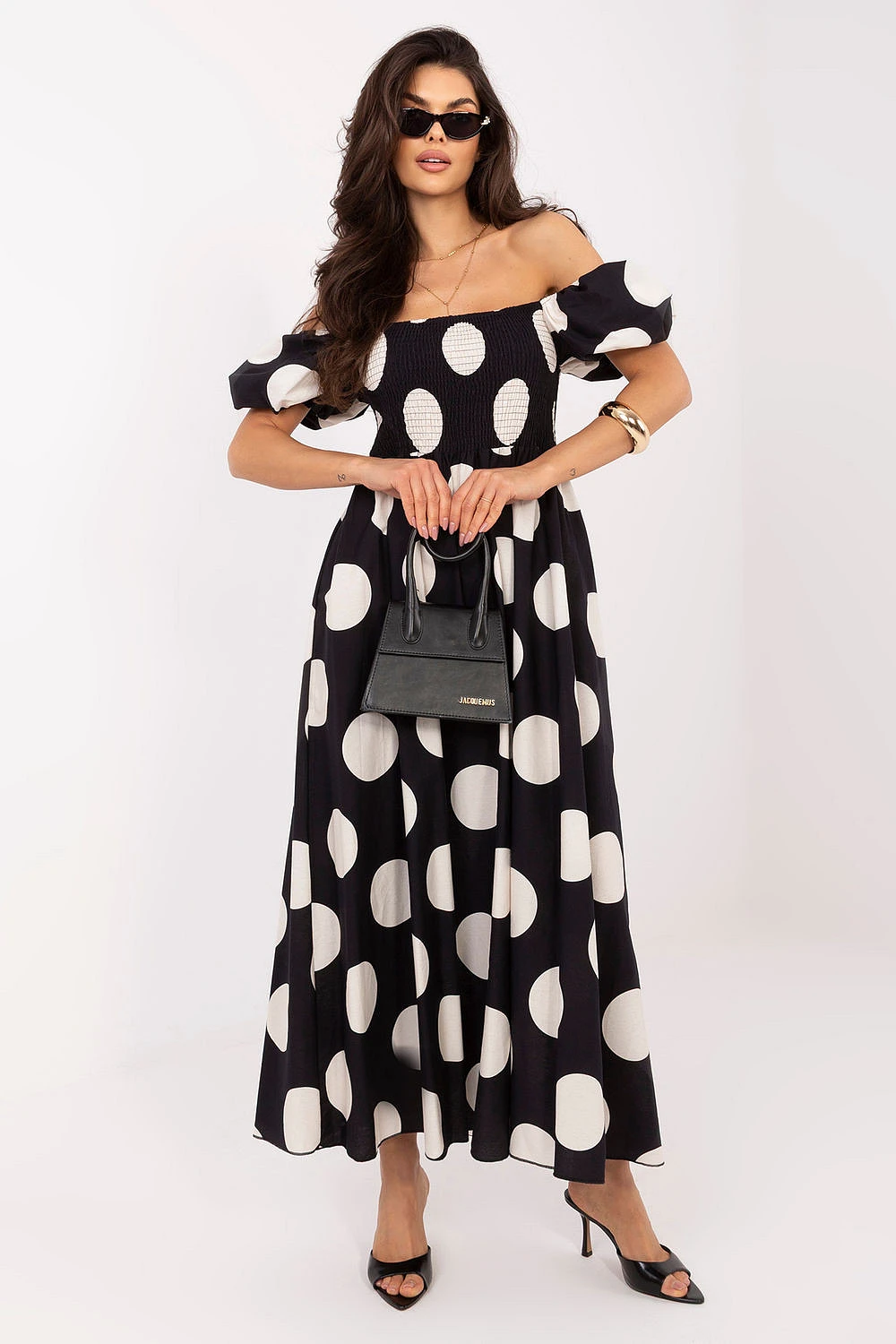 Šaty s rozšířeným střihem jsou stylovým a ženským návrhem, který se skvěle hodí jak na každý den, do práce, tak i na formální události. Vzor v puntíku jí dodává nadčasový šarm a jemnou lehkost, zapadá do klasických a zároveň moderních trendů. Model maxi délky krásně padne na postavě, španělský výstřih zdůrazňuje ramena a linii krku. Krátký baňatý rukáv dodává celku romantický charakter a jemný objem. Škrtidla s gumou v horní části umožňují dokonalé přizpůsobení obvodu, zajistí pohodlí nošení a přizpůsobení postavě. Bez zapínání jsou šaty praktické a snadné na nošení. Vyrobena z přírodní bavlny, je prodyšná, příjemná na kůži a skvělá na teplejší dny. Univerzální a elegantní návrh, který spojuje pohodlí s ženským, stylovým vzhledem.