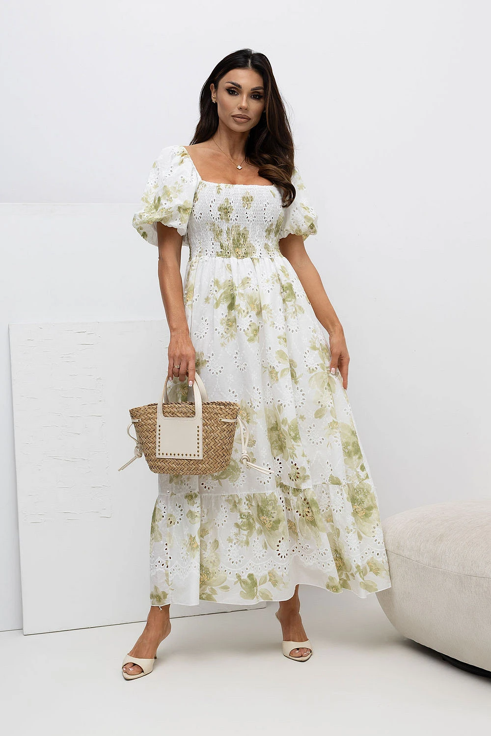 Letní šaty se skloněným střihem jsou lehkým a mimořádně ženským návrhem ideálním pro každodenní stylizace. Jejich vzdušný střih krásně padne na postavě, poskytující pohodlí a volnost pohybu v teplých dnech. Model midi délky ohromuje kombinací květinového vzoru s jemnými krajkovými ozdobami, které celku dodávají romantický a decentní charakter. Čtvercový výstřih elegantně zdůrazňuje linii krku a klíčníků, zatímco krátký nafouklý rukáv přidává lehkost a dívčí půvab. Žebrované manžety v horní části umožňují dokonalé přizpůsobení obvodu, zdůrazňující postavu a zvyšující komfort nošení. Bez zapínání je šaty praktické a snadné na oblékání. Vyrobena z přírodní bavlny je prodyšná, příjemná na pokožku a skvělá na letní dny. Je to stylová a pohodlná volba pro ženy, které oceňují romantické detaily a pohodlí v každodenních stylizacích.