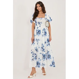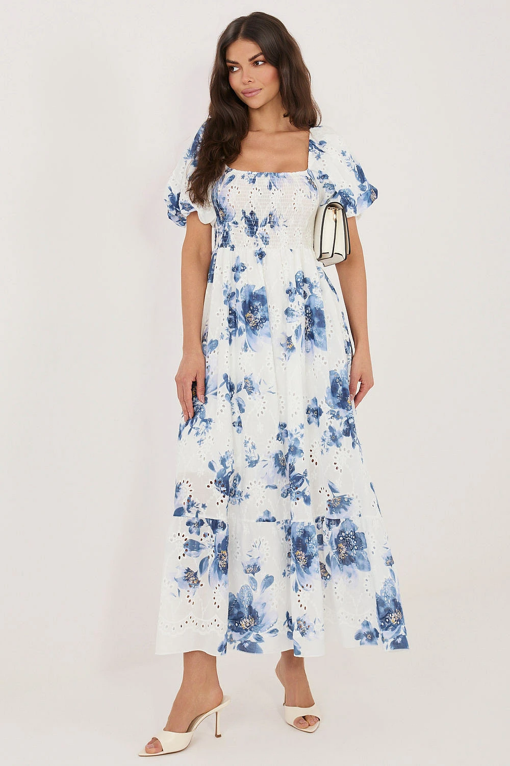 Šaty s rozšířeným střihem jsou lehkým a nesmírně ženským návrhem ideálním pro každodenní stylizace. Jejich lehký střih krásně padne na postavě, poskytující pohodlí a volnost pohybu v teplých dnech. Model midi délky okouzlí kombinací květinového vzoru s jemnými, ažurovými ozdobami, které dávají celku romantický a decentní charakter. Čtvercový výstřih elegantně zdůrazňuje linii krku a límců, zatímco krátký nafouklý rukáv přidává lehkost a dívčí kouzlo. Škrtící gumičky v horní části umožňují ideální přizpůsobení obvodu, zdůrazňující postavu a zvyšující pohodlí nošení. Bez zapínání je šaty praktické a snadno se oblékají. Vyrobena z přírodní bavlny, je prodyšná, příjemná na kůži a skvělá na letní dny. Je to stylový a pohodlný výběr pro ženy, které ocení romantické detaily a pohodlí v každodenních stylizacích.