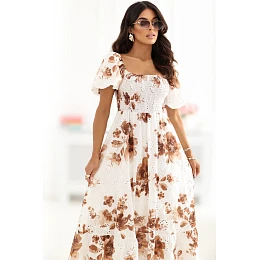 Šaty na léto s rozkročeným střihem jsou lehkým a mimořádně ženským návrhem ideálním pro každodenní stylizace. Jejich vzdušný střih krásně padne na postavě, poskytující pohodlí a volnost pohybu v teplých dnech. Model midi délky okouzluje kombinací květinového vzoru s jemnými krajkovými ozdobami, které dodávají celku romantický a decentní charakter. Čtvercový výstřih elegantně zdůrazňuje linii krku a klíčních kostí, zatímco krátký nadýchaný rukáv přidává stylizaci lehkost a dívčí půvab. Škrcení s elastickým pásem v horní části umožňuje ideální přizpůsobení obvodu, zdůrazňující postavu a zvyšující pohodlí nošení. Bez zapínání jsou šaty praktické a snadné na oblékání. Vyrobené z přírodní bavlny jsou prodyšné, příjemné na kůži a skvělé na letní dny. To je stylová a pohodlná volba pro ženy, které si cení romantických detailů a pohodlí v každodenních stylizacích.