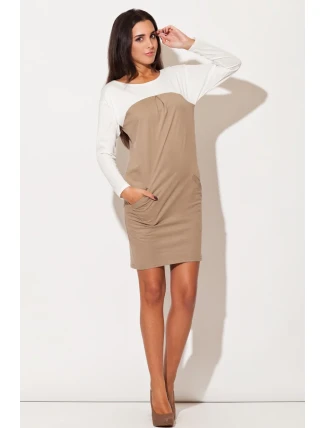 Decentní a dívky šaty, které vám dodá půvab a jemnost. Horní a dlouhé rukávy béžová, od poprsí řádek dolů šaty z bavlny. kartu trim na krku a kapsy dát mu charakter. Módní pohodlně vejde na bocích, trochu volnější kolem pasu.