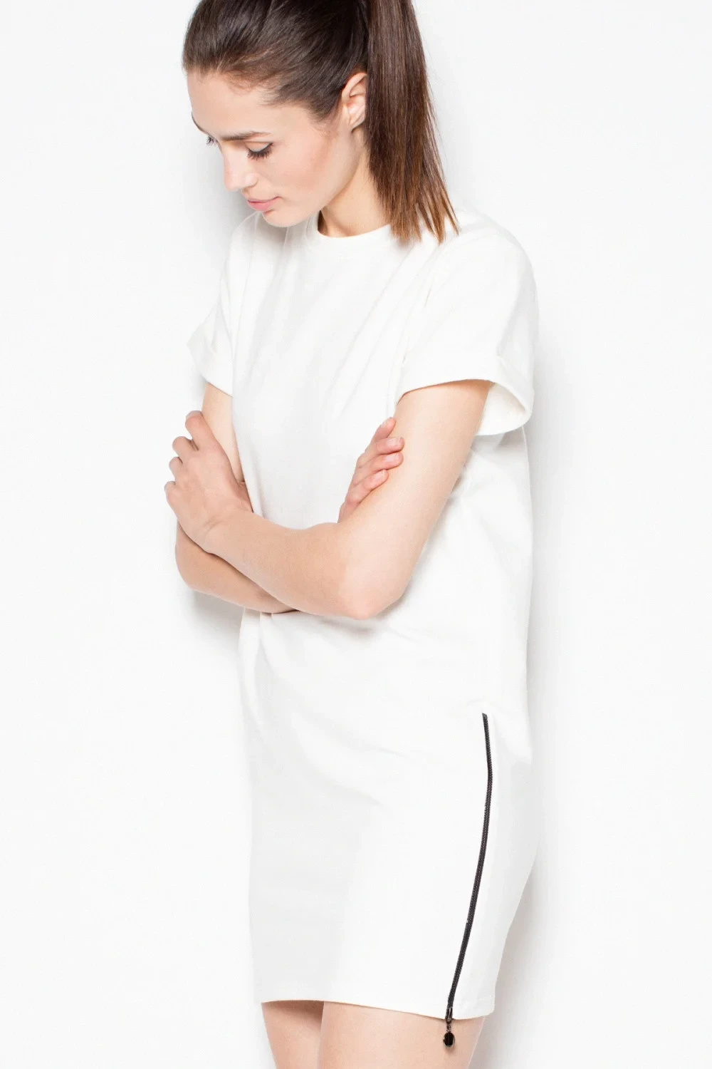 Šaty z příjemného teplákového úpletu. Pozoruhodné jsou ozdobné zipy umístěné po stranách, které dodávají celku moderní styl. Vhodné pro každodenní nošení i volný čas.