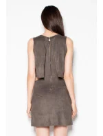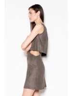 Šaty z měkké látky imitující semiš. Volný vrstvený top bez rukávů, zapínaný vzadu na krytý zip. Její jedinečný charakter dodávají působivé výřezy kolem pasu.