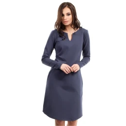 Oblíbený střih šatů pro každodenní nošení, áčkový střih s rozparkem ve výstřihu a mírně zaoblenou spodní částí, která opticky prodlužuje nohy. Dlouhé rukávy, boční kapsy a použití měkkého mikinového úpletu zajišťují maximální pohodlí tohoto každodenního stylu.