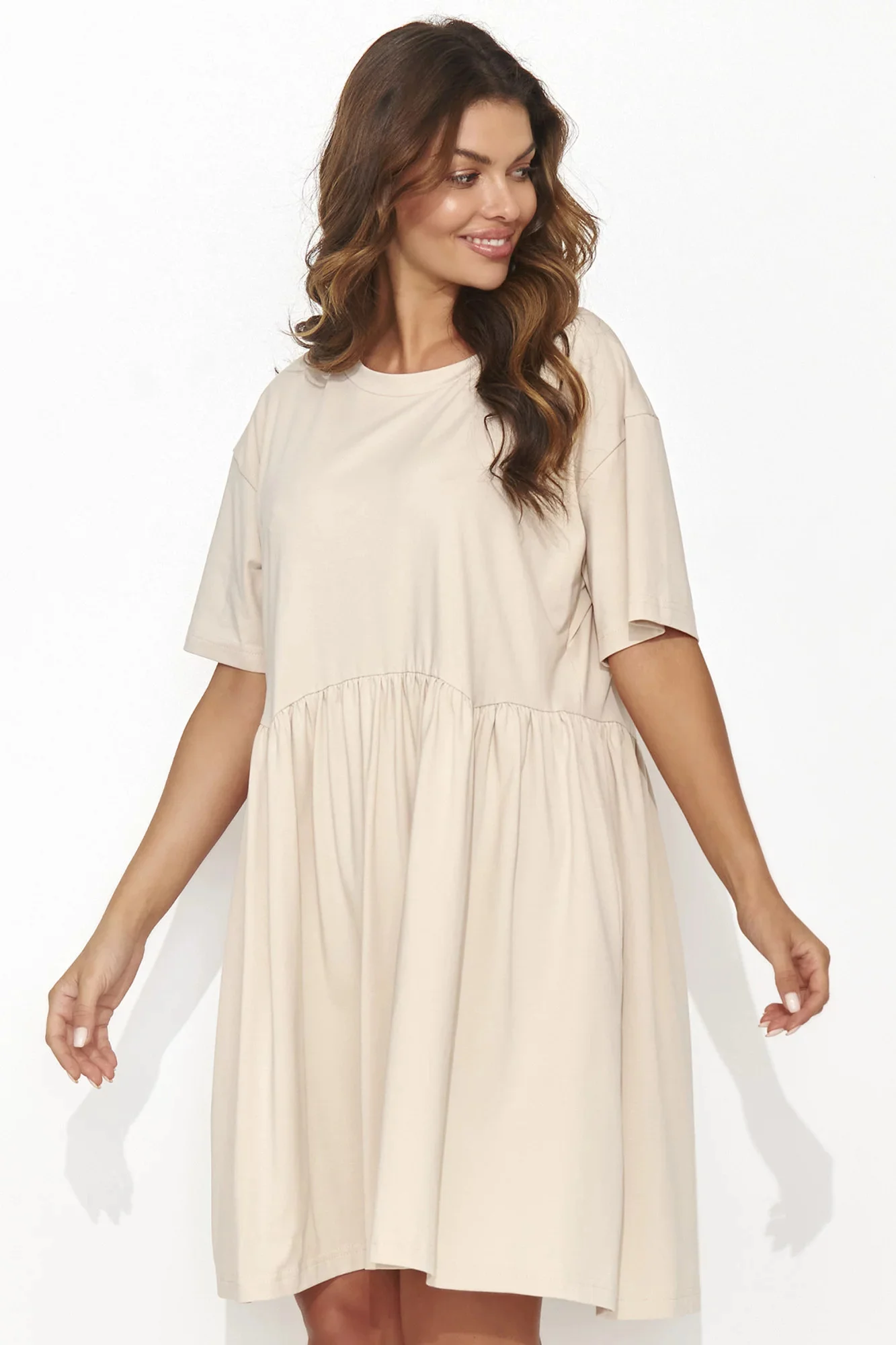Ležérní mini šaty s jedinečným šarmem, které mají na přední straně našitou elegantní zlatou destičku. Kreace s krátkými rukávy a ležérním střihem vyzařuje dívčí půvab. Kulatý výstřih dokonale podtrhuje bezstarostný vzhled a dodává lehkost a volnost. Tyto šaty, které jsou k dispozici v barvách moka, světle béžové, krémové, čokoládové a černé, jsou ideální volbou pro každodenní nošení a dodají styl každodenním aktivitám. Skvěle se uplatní v práci, ale i při setkání s přáteli. Vše je jen otázkou doplňků. Je to kombinace pohodlí, elegance a dívčí jemnosti a velmi pohodlný každodenní styl.