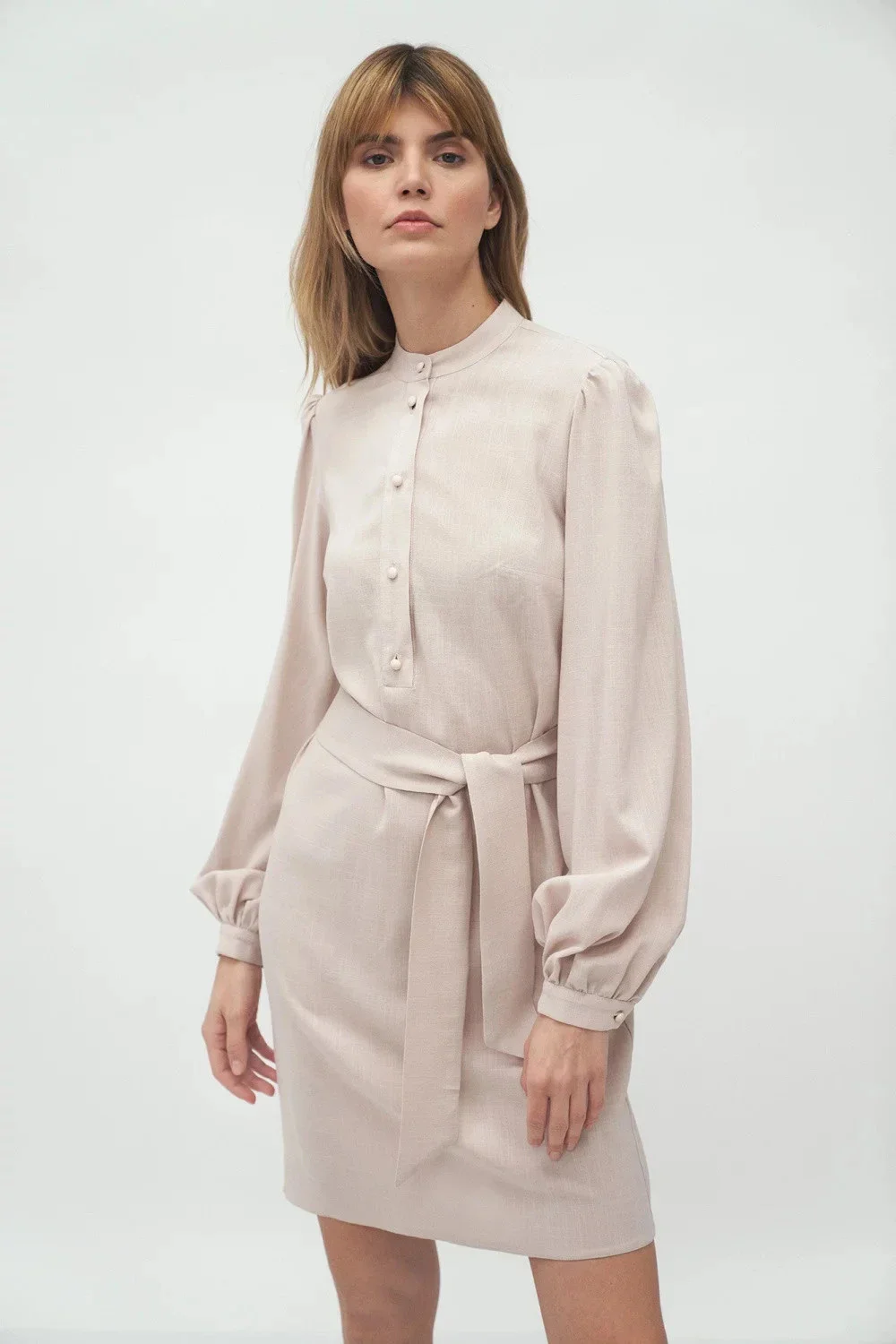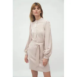Jednoduché šaty se stojáčkem, ideální pro každou postavu. Pokud máte rádi vypasované šaty, noste je zavázané v pase, pokud ne, pásek si sundejte. Rukávy s mírným řasením na manžetách dodávají jedinečný vzhled. Skvěle se hodí k botám na podpatku a balerínám. Na dotek příjemný materiál zajišťuje vysoký komfort nošení.