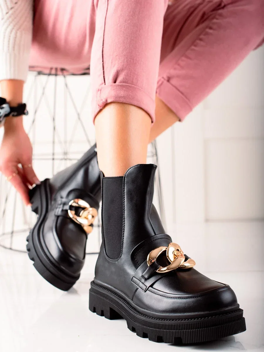 Designové dámské kotníčkové boty černé na plochém podpatku