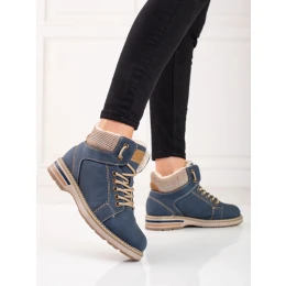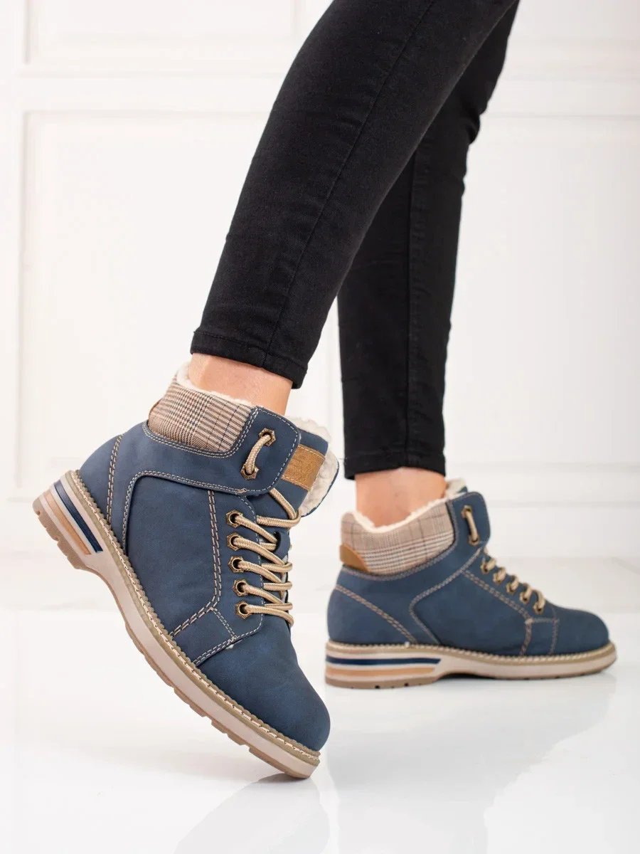 Designové kotníčkové boty modré dámské na plochém podpatku
