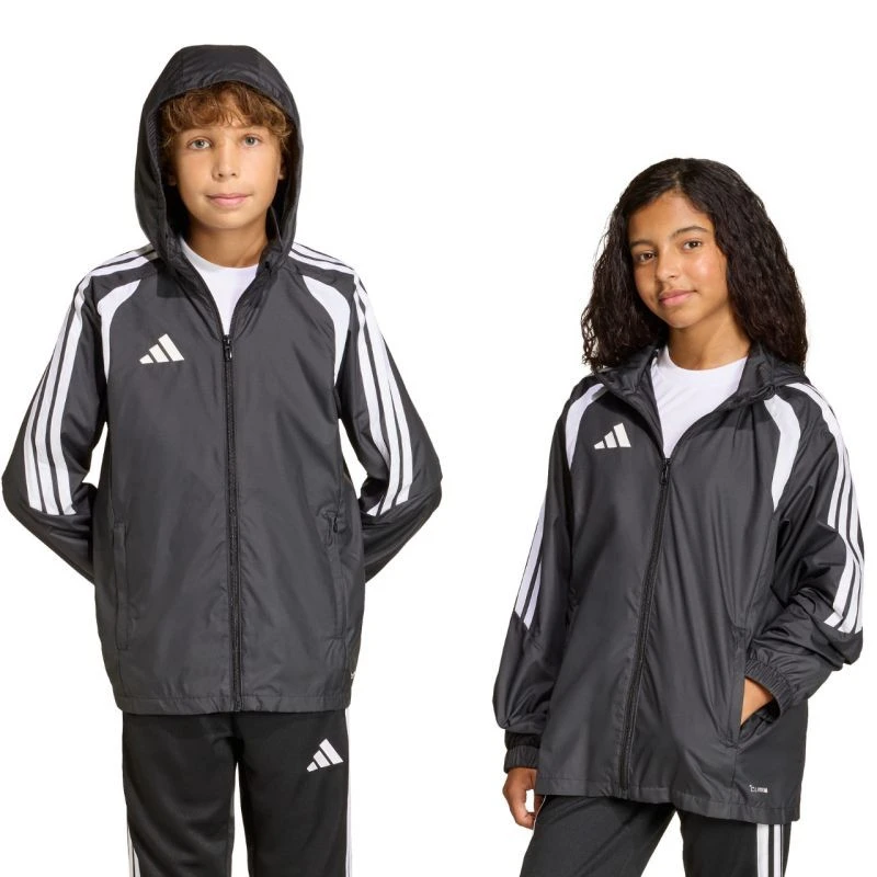 Dětská bunda adidas Tiro 26 League černá JY9726 Dětská bunda adidas pochází z řady Tiro. Síťovaná podšívka. Systém Clima365. Zip po celé délce. Nášivka na ochranu brady. Neodnímatelná kapuce bez možnosti regulace. Dvě boční kapsy na zip. Standardní střih. Manžety s elastickými manžetami. Technické údaje:- Materiál: 100% polyester (recyklovaný)- Standardní střih- Kapsy na zip- Síťovaná podšívka- Neodnímatelná kapuce- Elastické manžety.