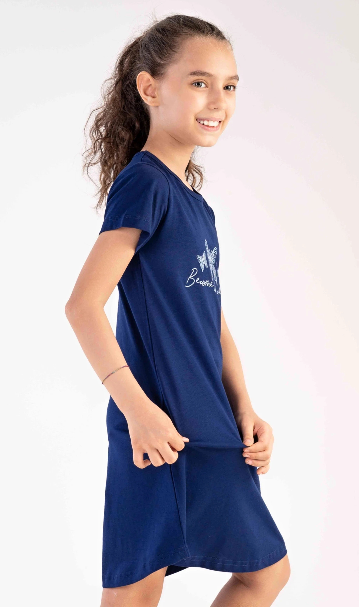 Dětská bavlněná noční košile s krátkým rukávem Butterfly. Na jednobarevné košilce s krátkým rukávem je obrázek tří motýlků. Použitý bavlněný materiál je poddajný a příjemný na dotek.