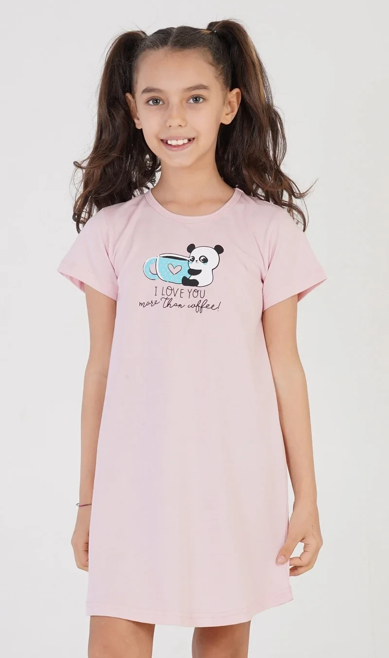 Dětská bavlněná noční košile s krátkým rukávem I love you. Na jednobarevné košilce s krátkým rukávem je obrázek medvídka pandy s hrníčkem a nápis I LOVE YOU. Použitý materiál je poddajný a příjemný na dotek.