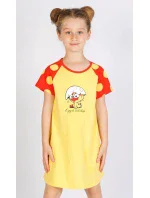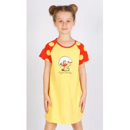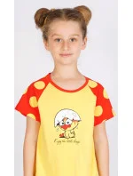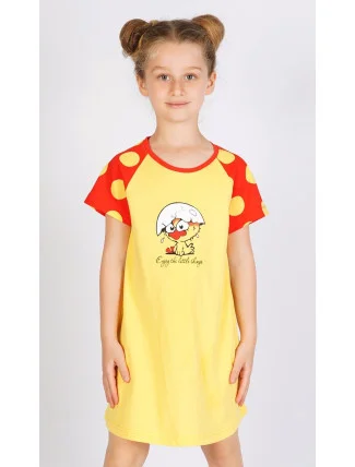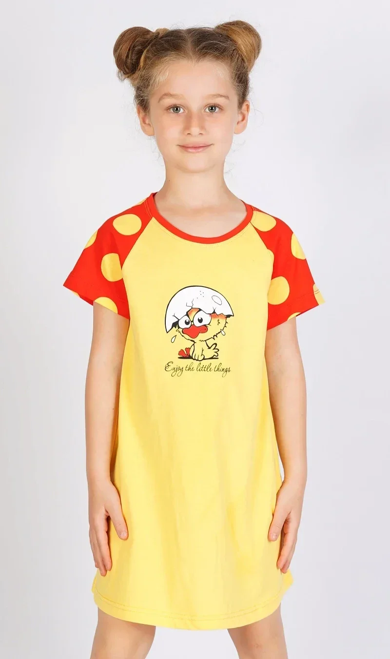 Dětská bavlněná noční košile s krátkým rukávem Kuře. Noční košilka má rukávky s velkými barevnými puntíky, na jednobarevném podkladu košile je obrázek roztomilého kuřátka se skořápkou na hlavě, pod kterým je nápis 'Enjoy the little things'. Použitý bavlněný materiál je příjemný a poddajný na dotek.