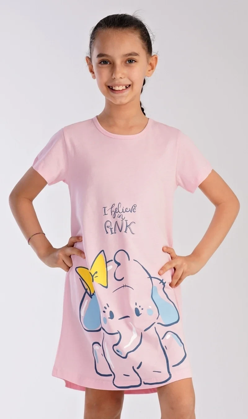 Dětská bavlněná noční košile s krátkým rukávem Slon. Na jednobarevné košilce s krátkým rukávem je obrázek slůněte a nápis 'I believe pink'. Použitý bavlněný materiál je poddajný a jemný na dotek.