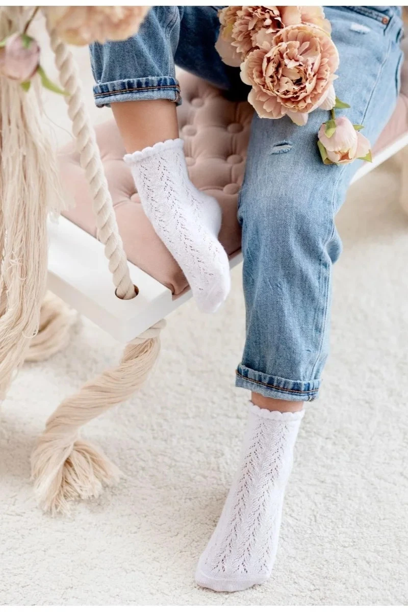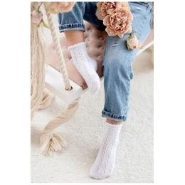 Dětské ažurové ponožky v bílé barvě jsou jemným doplňkem, který působí elegantně a zároveň lehce. Dekorativní úplet dodá ponožkám vzdušný vzhled a dobře se hodí k šatům, sukni i slavnostnějším outfitům. Bílá barva je univerzální, takže ponožky snadno sladíte s většinou oblečení na běžné nošení i na speciální příležitosti.