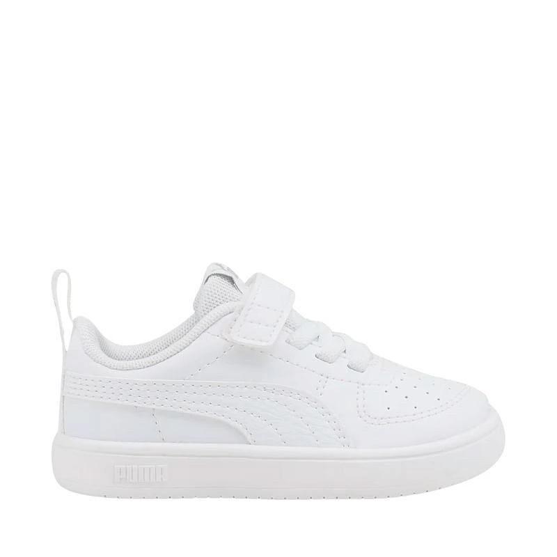 Puma Rickie AC+ Inf white 384314 01 Dětská obuv Puma pro každodenní nošení. Konstrukce z ekokůže. Perforace v přední části. Měkká textilní podšívka a pěnová stélka. Elastické gumičky připomínající šněrování. Přídavný pásek na suchý zip. Gumová podrážka.