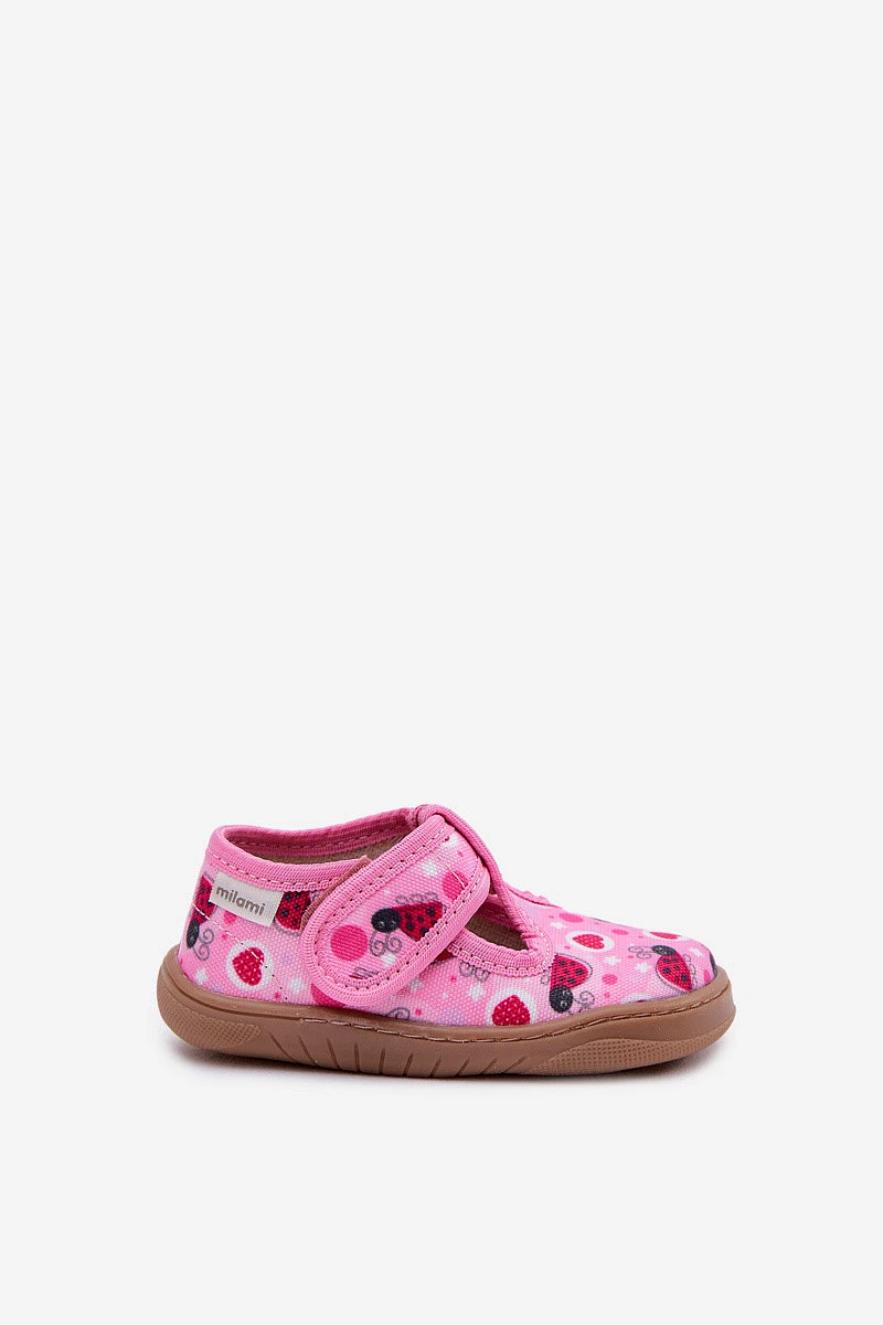 Dětské domácí pantofle Barefoot s červenými srdíčky na suchý zip Milami Růžové Talirae